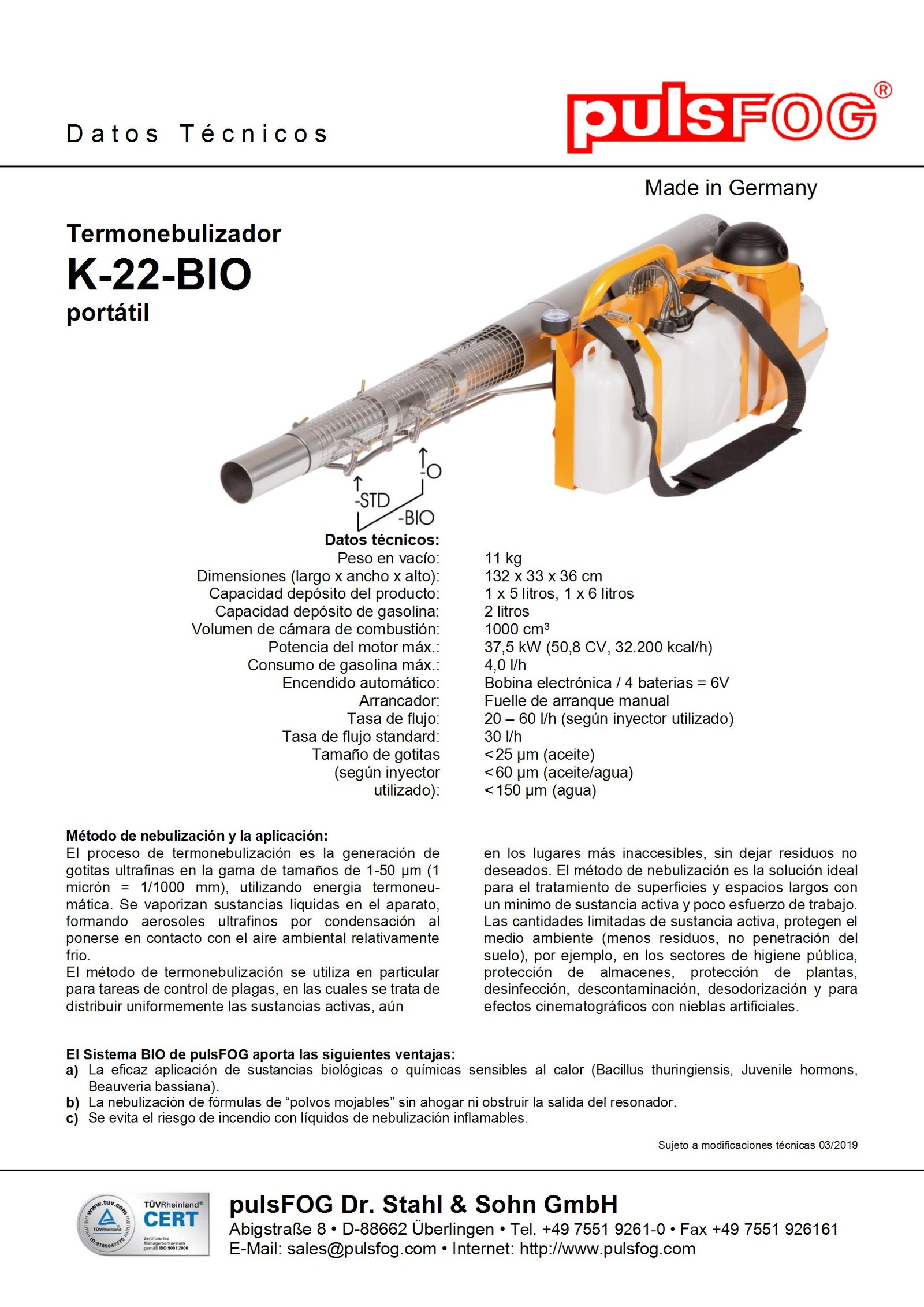 Documento técnico oficial de pulsFOG® correspondiente al termonebulizador portátil modelo K-22-BIO.