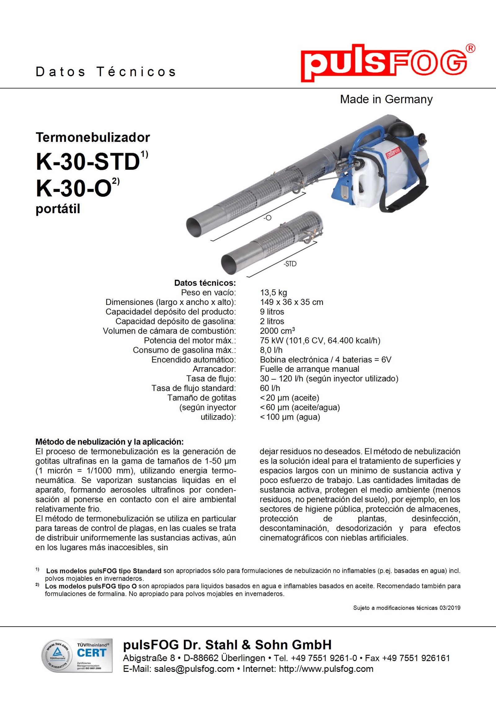 Documento técnico oficial de pulsFOG® correspondiente al termonebulizador portátil modelo K-30-O.